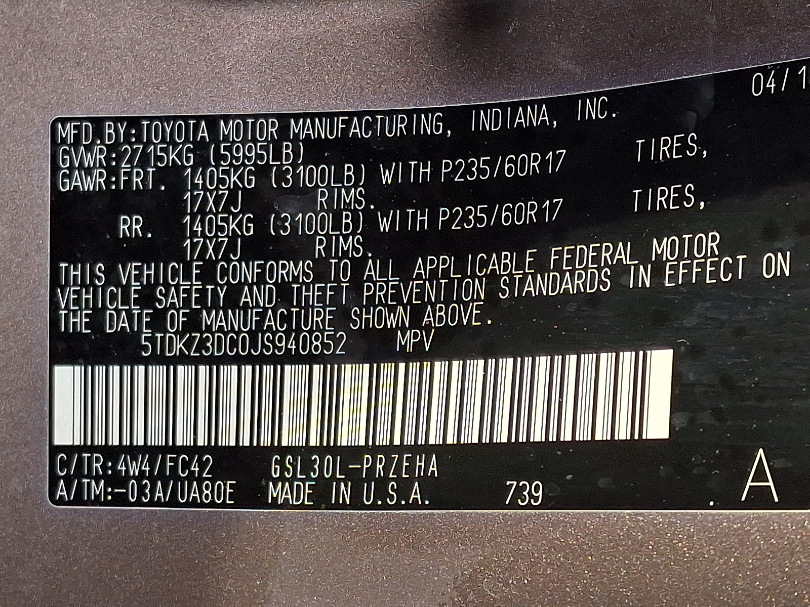 VIN 5TDKZ3DC0JS940852
