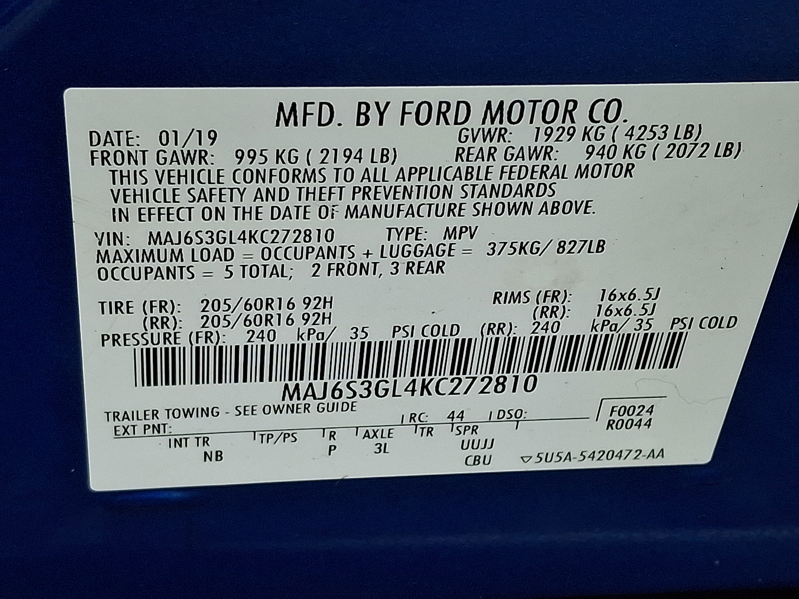 VIN MAJ6S3GL4KC272810