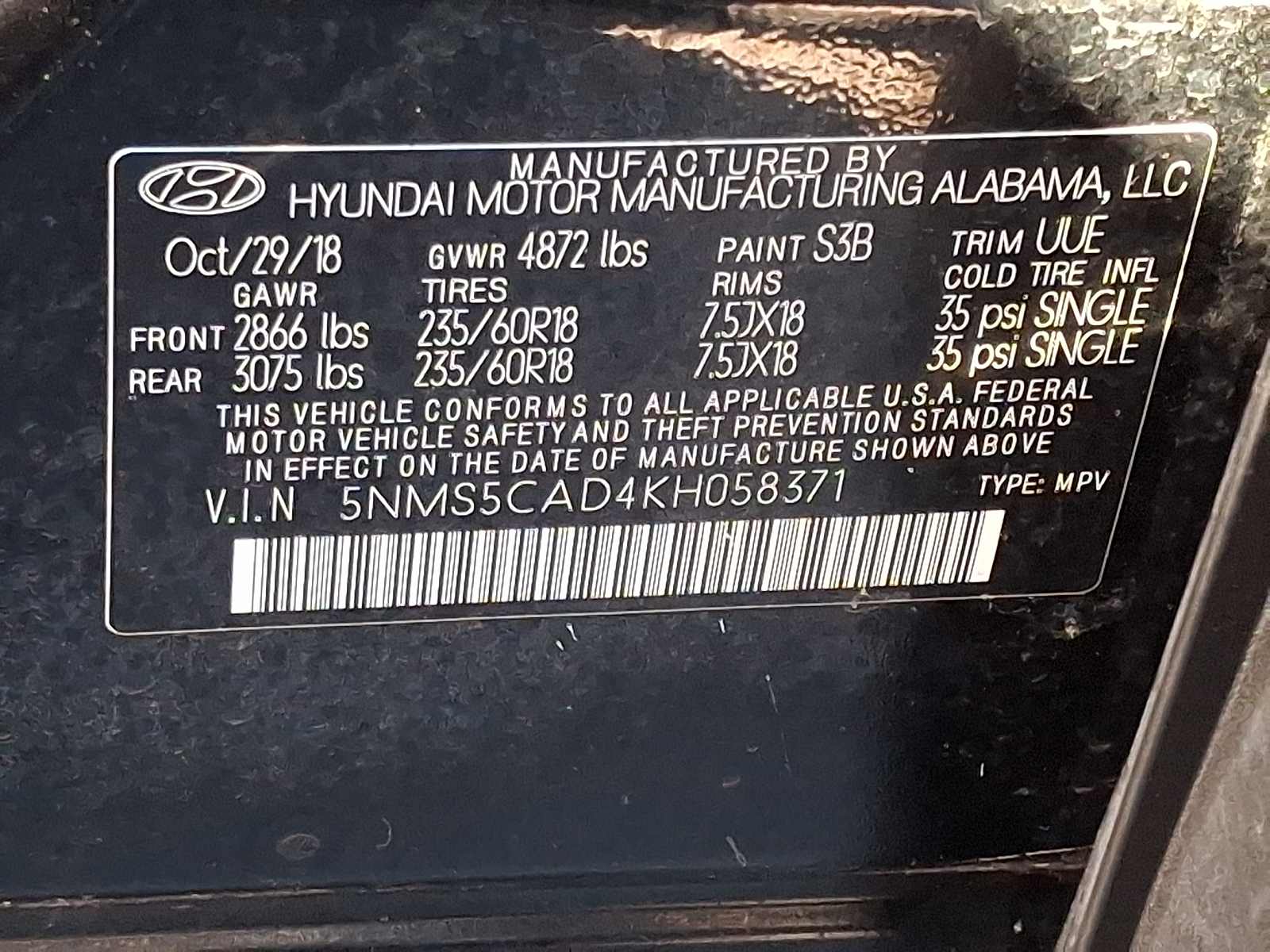 VIN 5NMS5CAD4KH058371