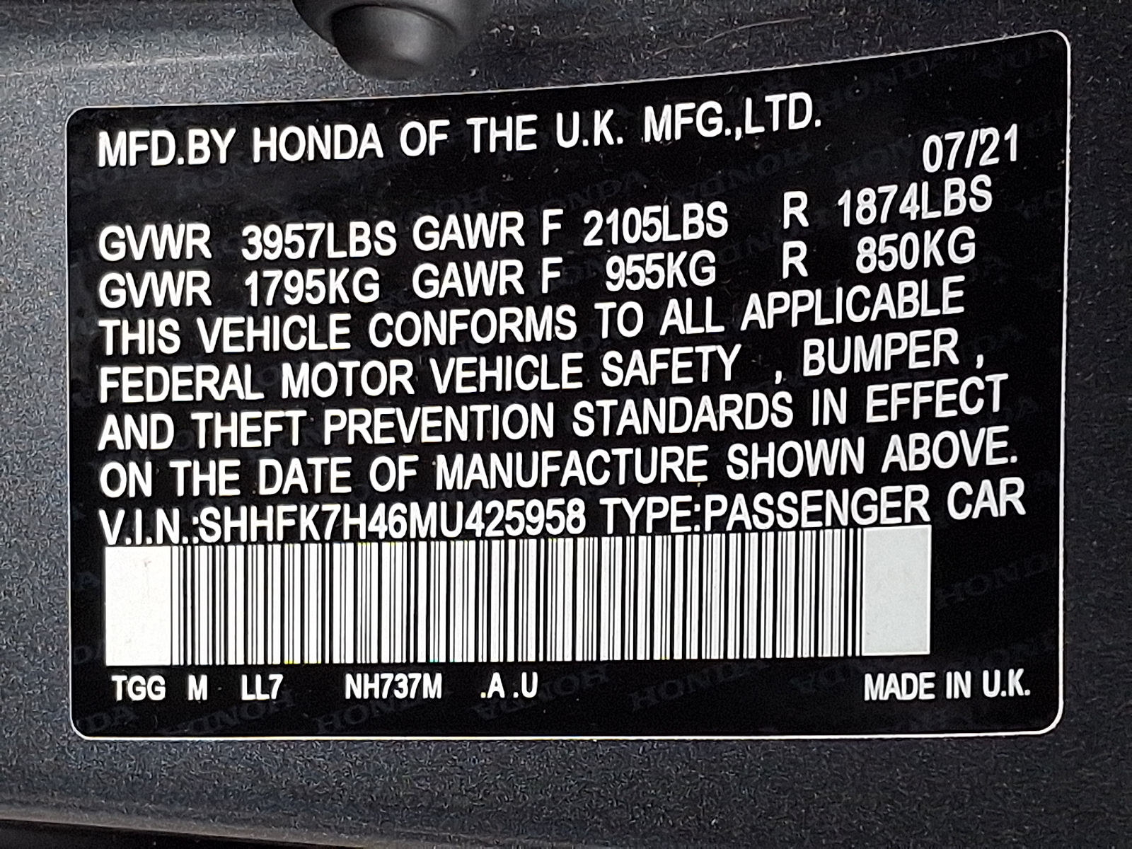 VIN SHHFK7H46MU425958