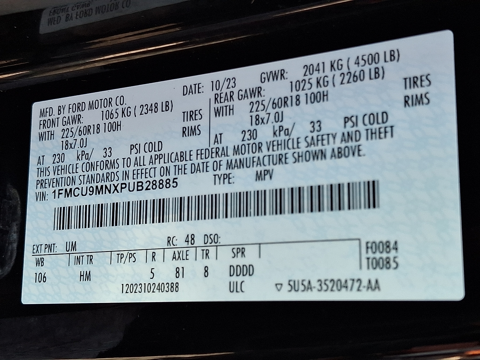 VIN 1FMCU9MNXPUB28885